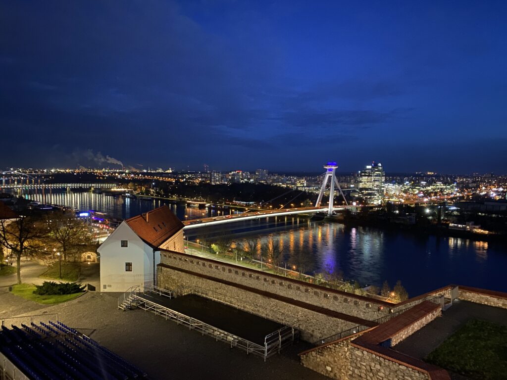 This is perhaps the most touristy thing to do with 1 day in Bratislava (or any amount of time in the city). And you know what? I still dig it. I made an impromptu decision during the evening to visit the UFO Tower, which stands looming over the city’s new bridge. You’ll spot the tower from just about every vantage point. Getting there by foot is doable, though it requires walking alongside the bridge and taking a winding path down to the ground, and you’ll then ride an elevator to the observation deck. If you don’t want to get in thousands of steps, I’d suggest taking a cab or rideshare instead.